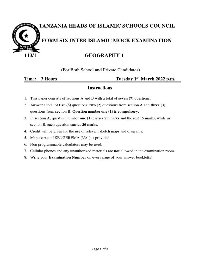 TANZANIA HEADS OF ISLAMIC SCHOOLS COUNCIL FORM FOUR INTER ISLAMIC MOCK EXAMINATION 2023